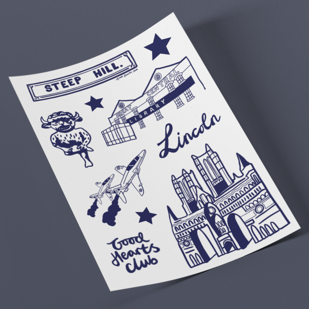 Celebrate the historic charm of Lincoln with this fun sticker sheet! Whether you're a local proud of your city or a visitor who fell in love with its medieval streets and iconic cathedral, these playful designs let you show your Lincoln spirit. Stick them on your laptop, water bottle, journal, or anywhere you want a touch of East Midlands pride. Perfect for souvenirs, scrapbooking, or just brightening up your everyday gear with a bit of local character.